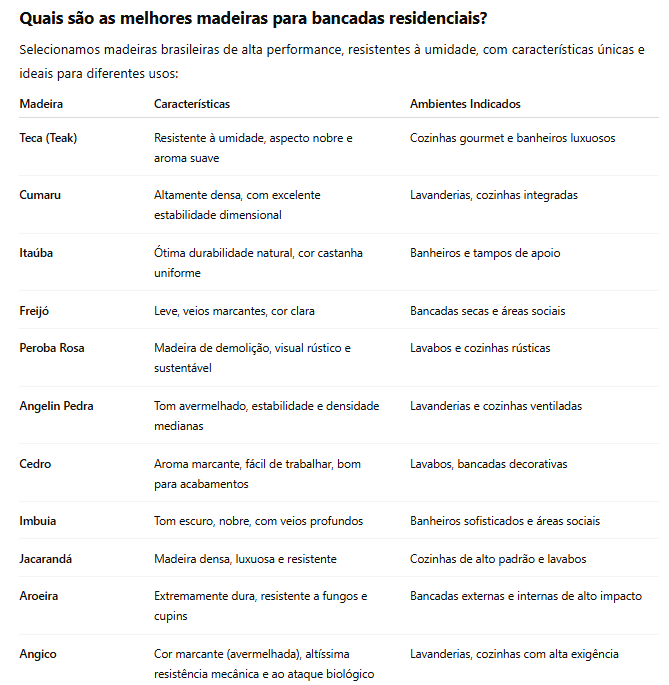 “Quer usar madeira sem medo? Escolha espécies com alta resistência natural, impermeabilize com frequência. Uma bancada bem cuidada é como vinho bom: só melhora com o tempo.”