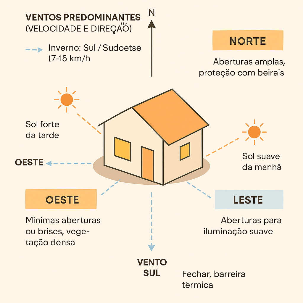 Estudos da Universidade de São Paulo (USP) e da Universidade Federal de Santa Catarina (UFSC) demonstram que uma residência bem orientada pode reduzir em até 40% o consumo energético apenas com o posicionamento correto de janelas, proteção solar e ventilação cruzada.