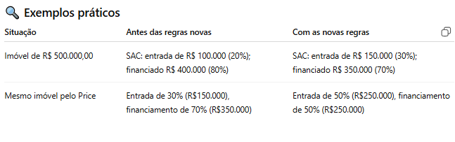 Pela Tabela Price (parcelas fixas): a entrada exigida subiu de 30% para 50%.