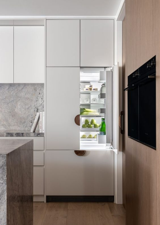 Visualmente, essas geladeiras são embutidas na marcenaria, criando um bloco arquitetônico elegante, sem recortes aparentes.